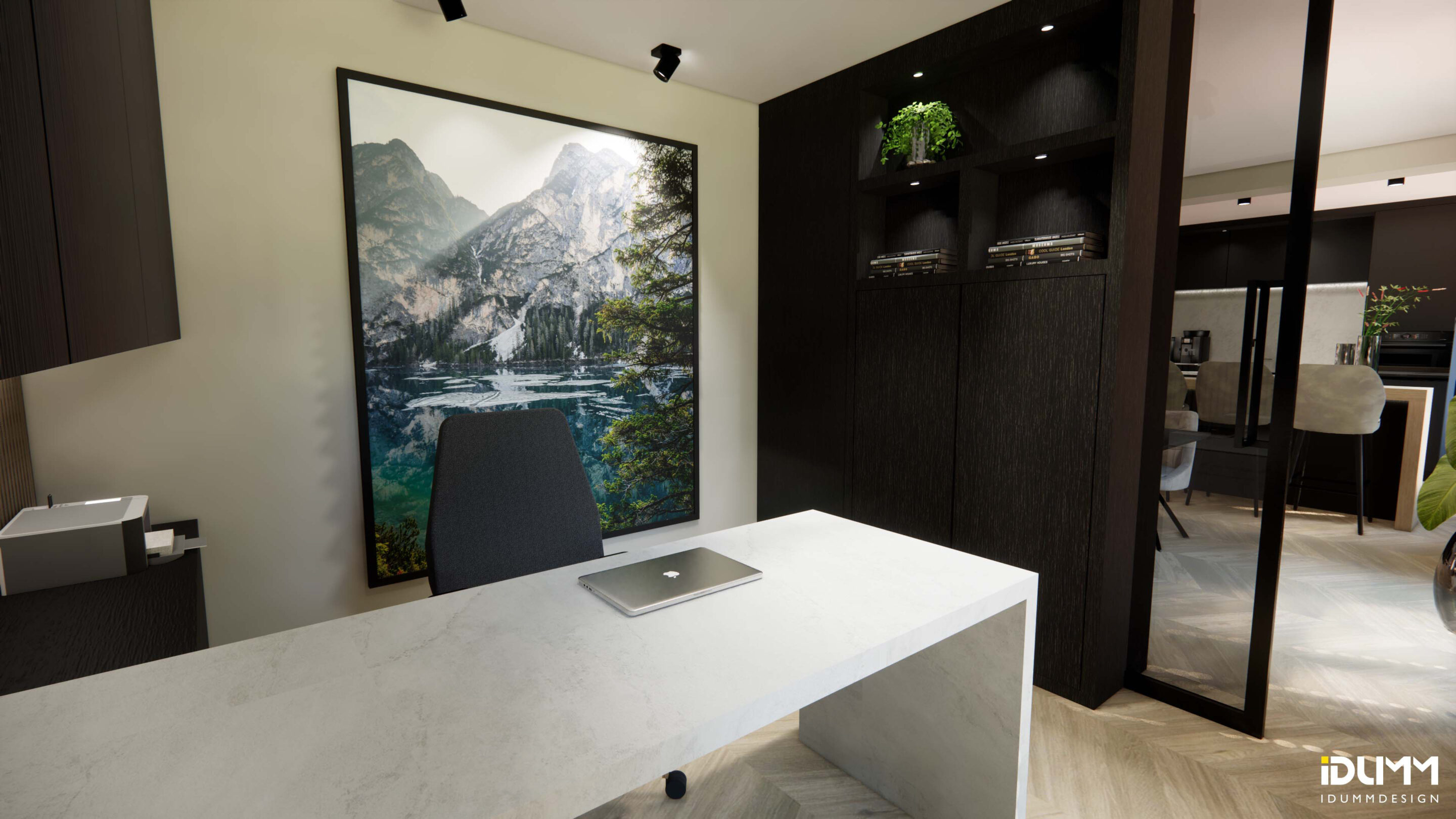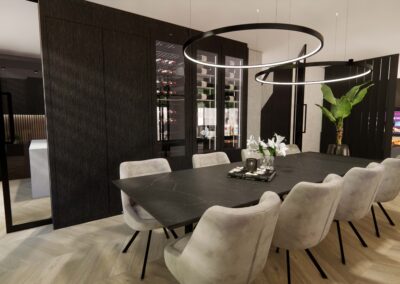 Het interieurontwerp van deze residentiële villa straalt een tijdloze charme uit, dankzij de combinatie van warme kleuren en chique materialen. Elke ruimte ademt een gevoel van luxe en comfort, waardoor de bewoners kunnen genieten van een verfijnde leefomgeving met een warme en uitnodigende ambiance. De residentiële villa is doordrenkt met een warme sfeer en straalt een tijdloze elegantie uit, dankzij het zorgvuldig gekozen kleur en materialenplan. Bij het betreden van de ruimte worden de zintuigen verwend met weelderige warme kleuren en chique materialen, die samen een luxueuze en uitnodigende ambiance creëren. Vanuit de keuken kun je direct doorlopen naar het prachtige kantoor welke door middel van een prachtige wijnmeubel met elkaar worden gescheiden.