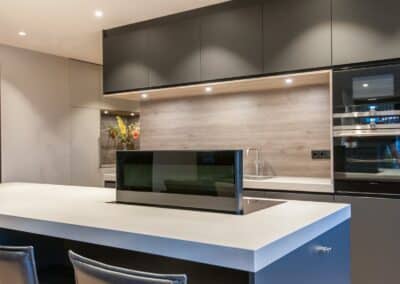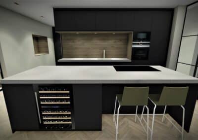Van ontwerp tot realisatie van deze maatwerk keuken in eigen beheer. Volledig in overleg en naar wens van de opdrachtgever. De combinatie van mat zwart Fenix met warm hout en een betonlook keramiek werkblad zorgt voor een ingetogen maar luxe uitstraling. Binnen deze keuken is gekozen voor apparatuur van Siemens en een downdraft afzuigkap van Novy. De wijnkoeler van Dunavox zorgt voor de extra wijnbeleving en de gezellige uurtjes in deze kwalitatief afgewerkte leefkeuken.